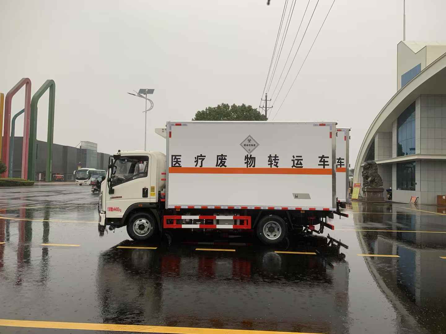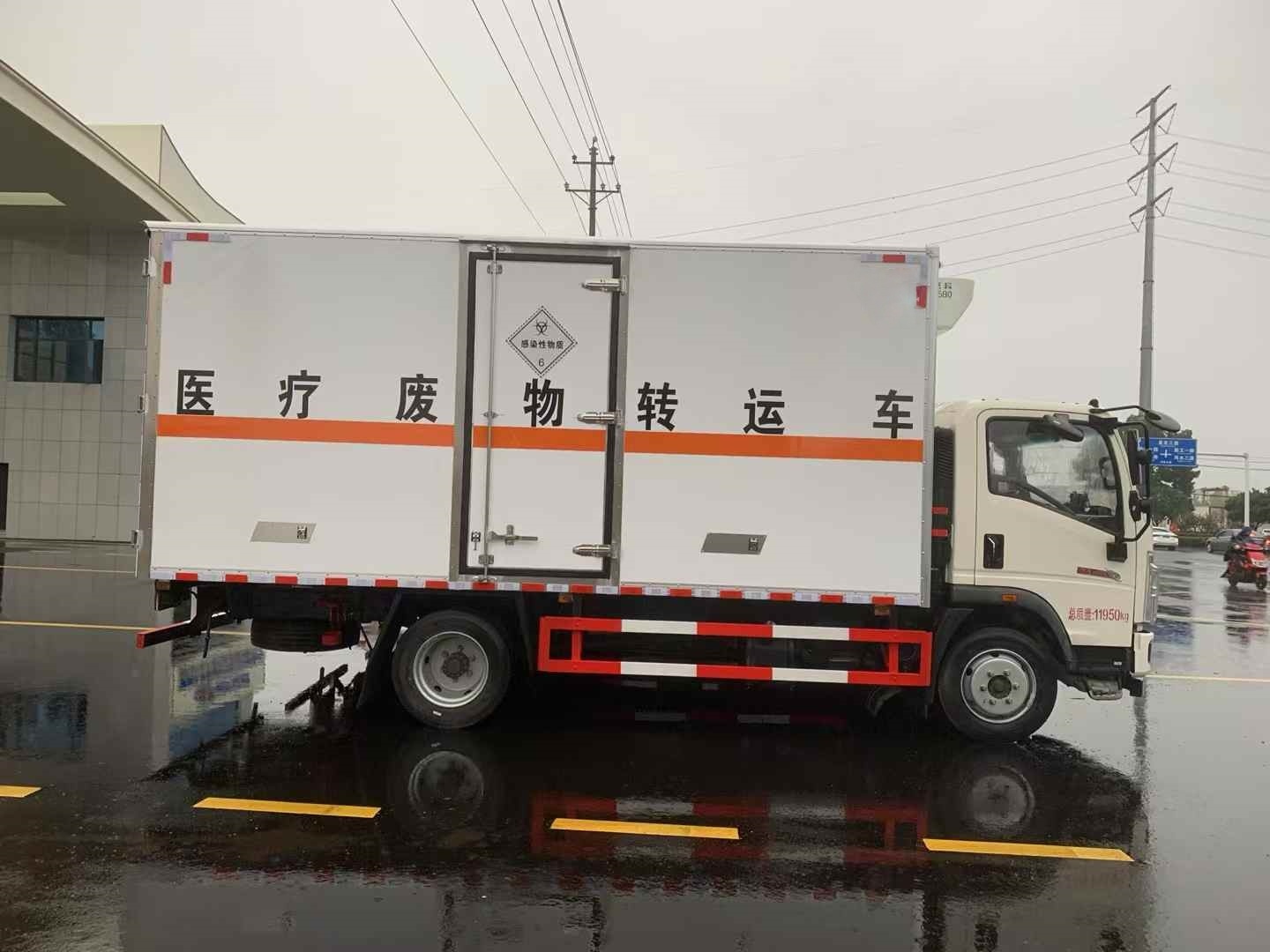 4台重汽豪沃国六医疗废物转运车分别为3台蓝牌4米2车型和1台黄牌5米2车型。采用的是专用危险品车底盘,匹配有潍柴160马力发动机和潍柴130马力发动机。车身采用高强度钢材打造,搭配一体化密封货厢与双重防渗设计,有效杜绝转运过程中渗漏、遗撒风险;车内配备紫外线消毒系统、恒温控制系统与智能监控终端,实时监测货厢温度、密封状态,确保医疗废物从装车到卸车全程处于安全可控环境,避免二次污染。