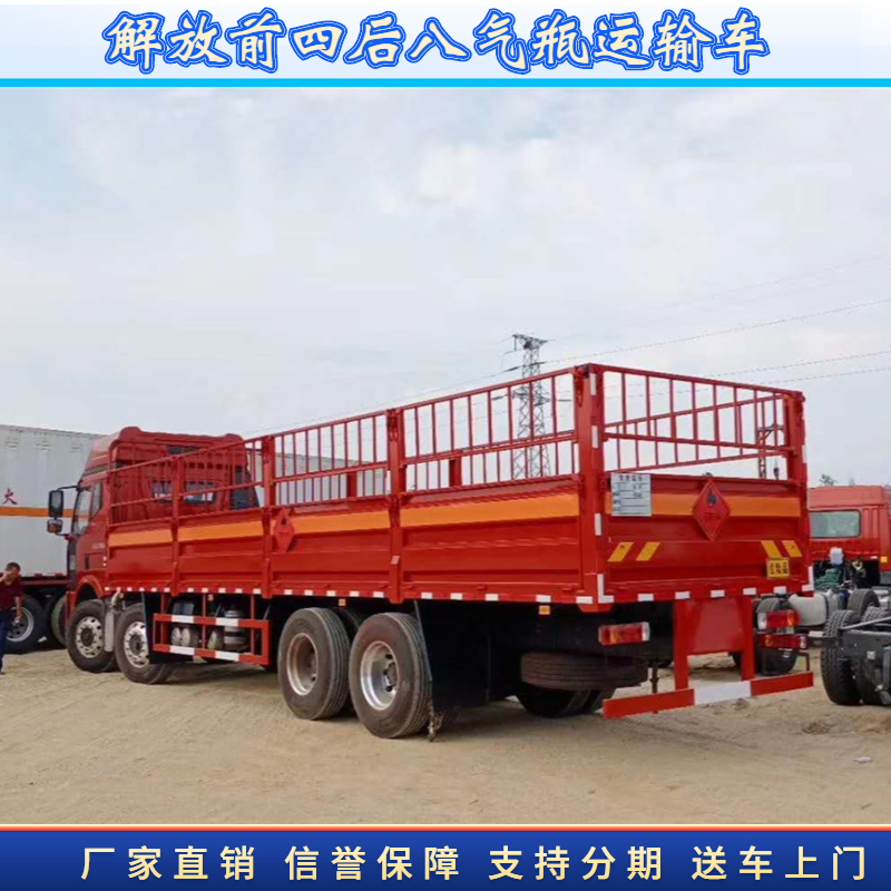 解放前四后八气瓶运输车整车外形尺寸(mm):11995×2550×3505,厢体内尺寸(mm):9300×2400×800。 解放前四后八气瓶运输车底盘配置介绍:J6M全浮高顶大排半驾驶室、电动玻璃升降、手动后视镜、驾驶员座椅为空气减振座椅、单DIN北斗兼容车载系统(触摸屏)、电源总开关控制开关,大柴CA6DK1-32E51(FCRI+SCR气驱、双腔空压机),变速箱CA9TB160M变速器(9档全铝壳体、法兰输出取力器),车桥Ф435冲焊桥(国产ABS、2孔V杆),4.444,300×80×8,12R22.5型18层级无内胎(铝合金轮辋),自动空调、300L铝油箱、铁保险杠、高效单空滤、铝散热器、驾驶室后两点空气悬置、动液压举升装置、悬架为前少/后气囊、前盘式制动器、后桥楔式制动器、排气尾管前置、车辆速装置、排气火花熄灭器、整车配备静电拖地带1根、驾驶室带2kg干粉灭火器1个、电子手油门、铝合金贮气筒、150Ah蓄电池、前下防护装置、发动机体现5万公里长换油周期、右转弯音响提示装置、T-box1.1、安全带佩戴提醒、制动器衬片更换报警、爆胎应急安全装置、后悬架电控空气悬架。