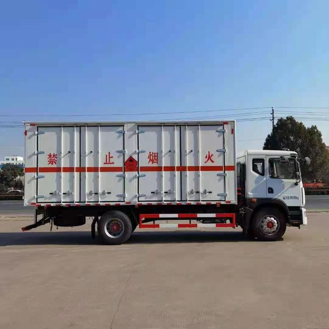 东风D9国六带双开侧门危险品车采用东风多利卡D9平头带卧汽车,康明斯发动机220马力国六排放标准,带方向助力,空调,8档变速箱295真空纲丝胎,带前盘式刹车,ABS,限速装置,大灯高低可调,安装防飞溅档泥板,三角垫木,反光背心,底扳采用4mm厚纲板制作,带活动可拆卸高栏,底部铺静电胶皮。带危险品三角灯防火罩。
