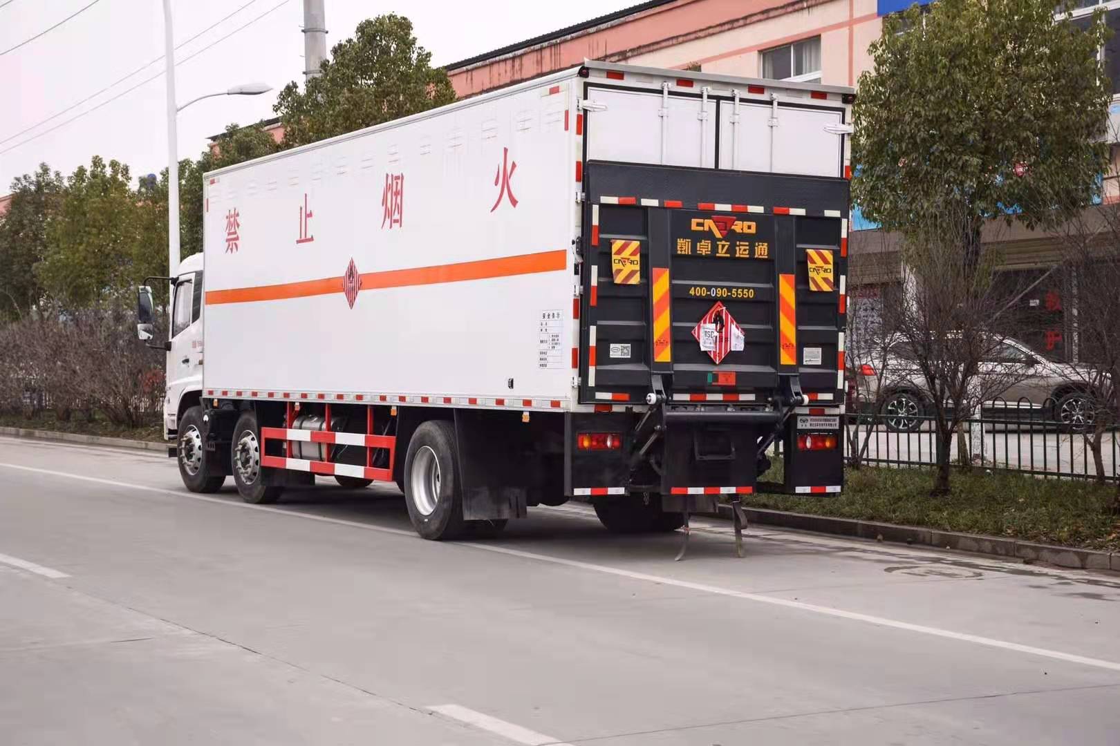 东风天锦7米7国六危险品车厢体采用外饰冷轧钢板,内饰铝合金板,中间填充隔热阻燃材料,(选装侧门和隔仓)厢体两侧上方设有防雨功能自然通风窗口,底部铺有阻燃导静电胶板,厢体侧面装有固定拉环,与捆绑带使用捆绑货物以避免移动。在车厢内顶部安装感烟报警器,在门器框上方安装有防盗报警器,厢体外侧安装示廓灯及灭火器支架,配置两个灭火器,并有“严禁烟火”和“爆”等字样,厢体周边贴反光标识。后门贴有安全告示,危险品标牌。车辆尾部安装两条拖地导静电胶带,驾驶室顶部装有安全三角灯。厢体颜色有:黄、白、灰色等可选。