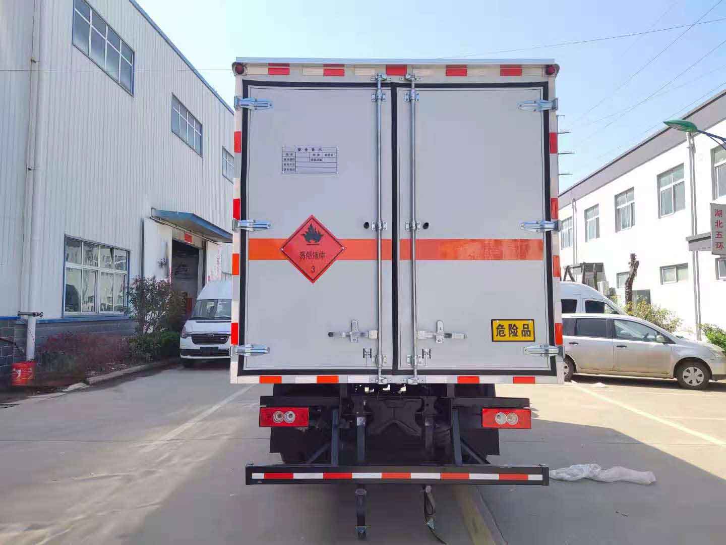 福田欧马可黄牌危险品厢式车采用福田欧马可专用危险品车底盘,3800mm轴距,福田欧马可宽体驾驶室,康明斯156马力发动机,6档变速箱,6.5吨后桥,9R22.5 14PR轮胎,断气刹,中控锁,电动门窗,多功能方向盘,定速巡航,空调,前碰撞预警,轨道偏移预警。整车尺寸:7180×2350×3400mm,厢体尺寸:5150×2200×2080mm,严格按照公告尺寸制作,外板采用1mm厚冷轧板有一次性成型的百叶窗,内饰为导电性能良好的铝板有透气孔,内衬为矩形管骨架牢靠稳定,内部填充为透气防潮阻燃的挤塑板,四种材料经现代工艺复合而成,厢体外部上下铝合金型材包边,底板和车厢前下部铺橡胶皮,后门双开,右侧前部单开门,内部有固定货物的卧环,车辆外部有静电带、灭火器、防火罩,车厢内安装烟雾报警器和门防盗报警器,严格按照国家危险品相关法规张贴。