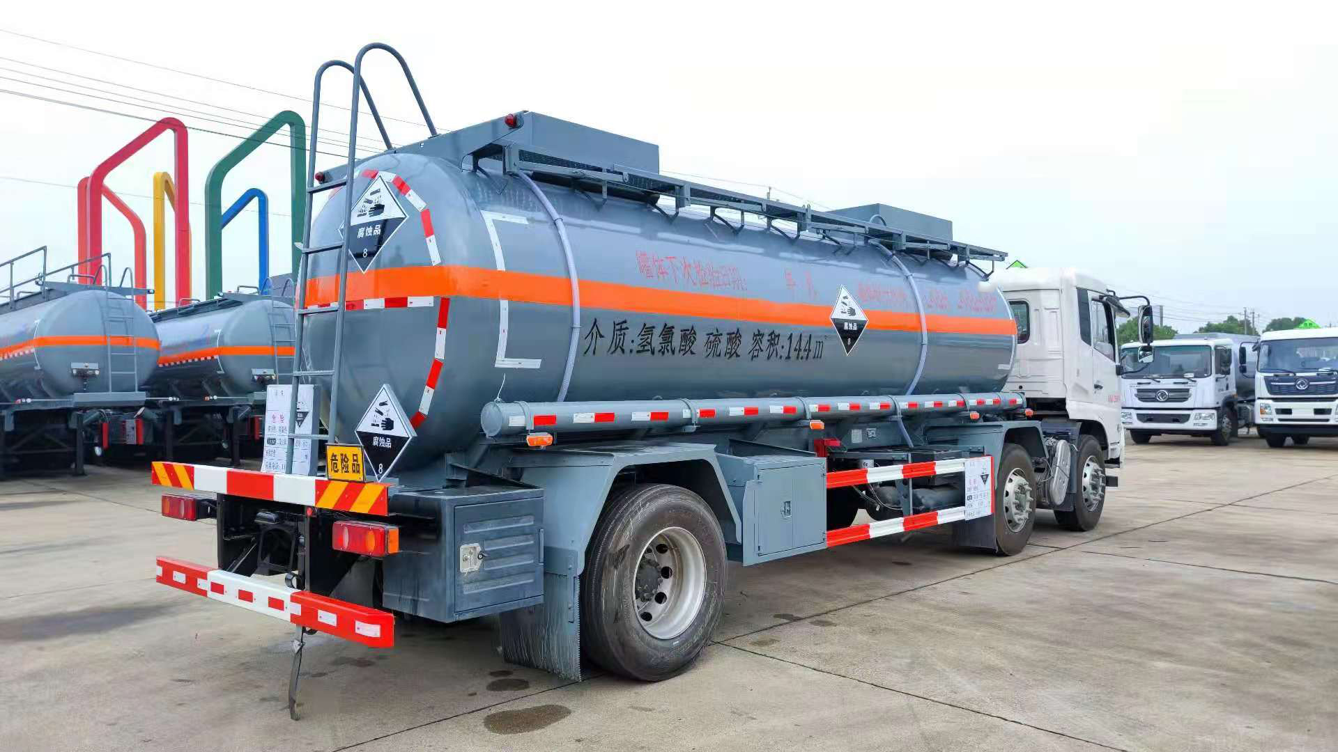 东风天锦三轴腐蚀品罐式运输车罐体采用碳钢Q235按GB18564.1制作,筒体厚度及封头厚度符合18564.1设计,罐内聚乙烯滚塑16MM厚,罐体按国家标准采用圆型状截面。罐顶两侧带钢网走台及碳钢活动护栏. 罐顶2个全塑罐盖,带四方保护箱, 2个PP排气阀,罐顶预留1个安全阀法兰.罐体单仓,罐内双层钢衬塑防浪板按设计,罐底底口位置加装一个DN100不锈钢衬氟海底阀带紧急切断装置(加装海底阀5公里语音报警装置),采用4寸无缝管/出料管道内滚塑,后尾部左右自流各配一个DN80 PP球阀带DN80 PP出口,出口带塑料保护箱.罐体两侧为全塑炮筒式卸料管,配两条和罐体一样长的卸料钢丝软管,2个4KG灭火器,工具箱一个,在罐体左右、后正中部加贴“八类”标识,油漆国标深灰色,整车左右以及后尾部各一块安全告示牌,后爬梯,整车左右挡泥板及所有附件安装均按公告图片制作.