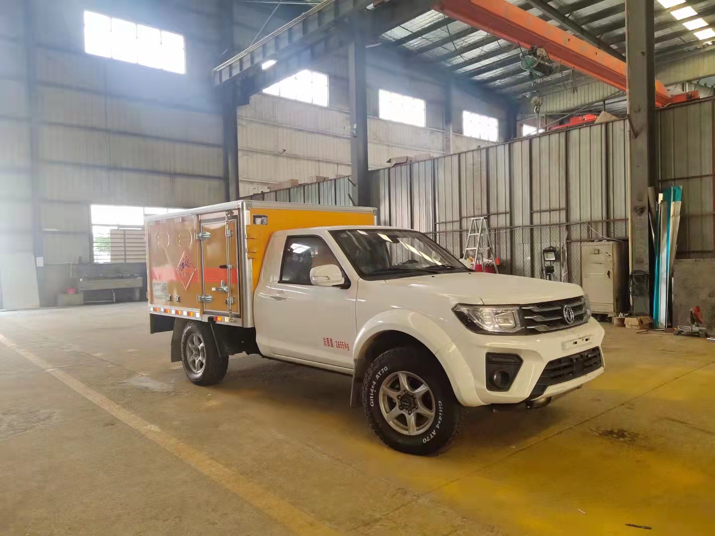风日产四驱皮卡民爆器材运输车整车尺寸:5085×1820×1920mm,厢体尺寸:2160×1390×1200mm。严格按照公告尺寸制作,外板采用1mm厚冷轧板有一次性成型的百叶窗,内饰为导电性能良好的铝板有透气孔,内衬为矩形管骨架牢靠稳定,内部填充为透气防潮阻燃的挤塑板,四种材料经现代工艺复合而成,厢体外部上下铝合金型材包边,底板和车厢前下部铺橡胶皮,后门双开,右侧前部单开门,严格按照国家危险品相关法规张贴。