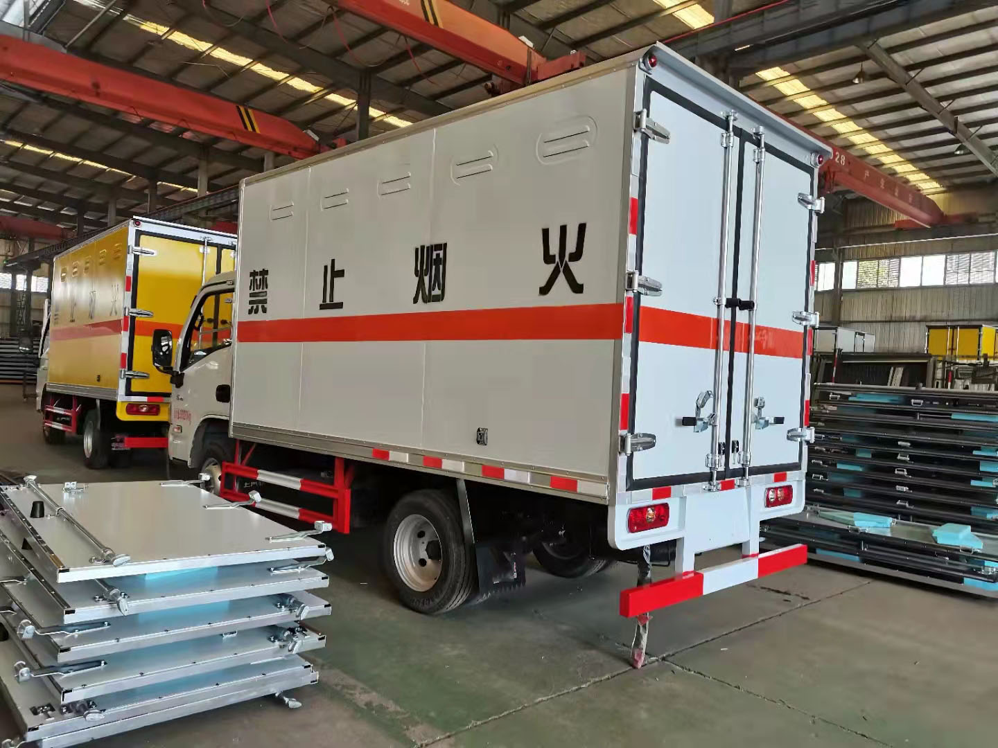 跃进国六汽油腐蚀品厢式运输车外形尺寸:5160/5050X1900X2700内部尺寸:3350/3100X1750X1740,厢体生产工艺采用可产生静电屏蔽效应的冷扎钢板,中间为B1级阻燃泡沫,内饰铝板。底板为花纹板上铺防静电胶皮。厢体右侧中开单侧门一个,厢内两侧加装单排固定货物卧环,后部带防盗报警器,顶部带烟雾报警器,其他按危险品厢式运输车标准制造。