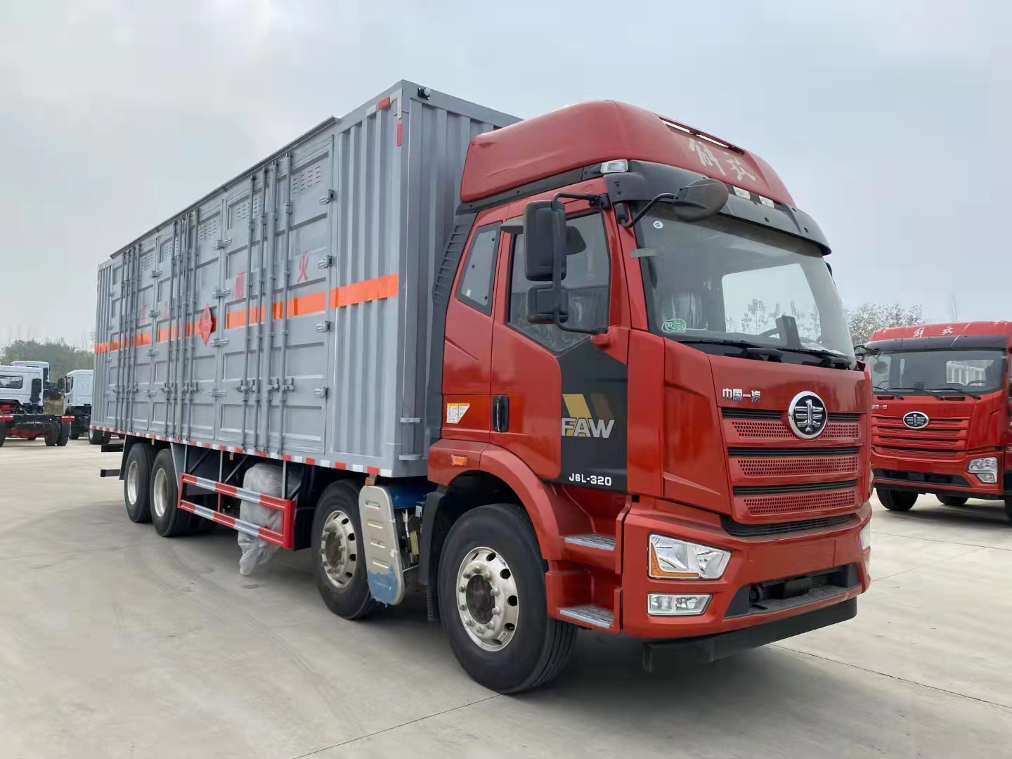 解放前四后八国六瓦楞板危险品车采用的是新J6L全浮高顶排半驾驶室、液晶仪表、电动玻璃升降、电动后视镜、侧围网兜、后围窗帘导轨、全景窗帘导轨、驾驶员座椅为空气减振座椅、单DIN北斗兼容车载系统、电源总开关控制开关,大柴CA6DK1-32E61(EGR+DOC+DPF+SCR、双腔空压机、发动机制动),变速箱CA10TA130M变速器(全铝壳体),车桥ф435冲焊桥(进口ABS、1878轮距、2孔V杆),速比3.727,12R22.5型18层级轮胎(轻量化轮辋、双钱花纹RR100/朝阳花纹AS578/正新花纹CR260),270×75×(7+5),自动空调、前下防护装置、驾驶室四点螺簧悬置、一体式宽体保险杠、电动液压举升装置、后悬2500mm、车辆限速、排气火花熄灭器、整车配备静电拖地带1根、驾驶室带2kg干粉灭火器1个、悬架3/3/-(8气囊)、排气尾管及消声器前置、前盘后楔式制动器、右转弯音响提示、爆胎应急安全装置、安全带佩戴提醒、制动衬片更换报警、铝油箱300L、T-box1.5、U型后处理、EBS+ESC、单胎带TPMS(胎压监测)、铝贮气筒、LDW+FCW、天线操纵、排气节流阀、AEBS(自动紧急制动)。轴距1900+4500+1350mm。