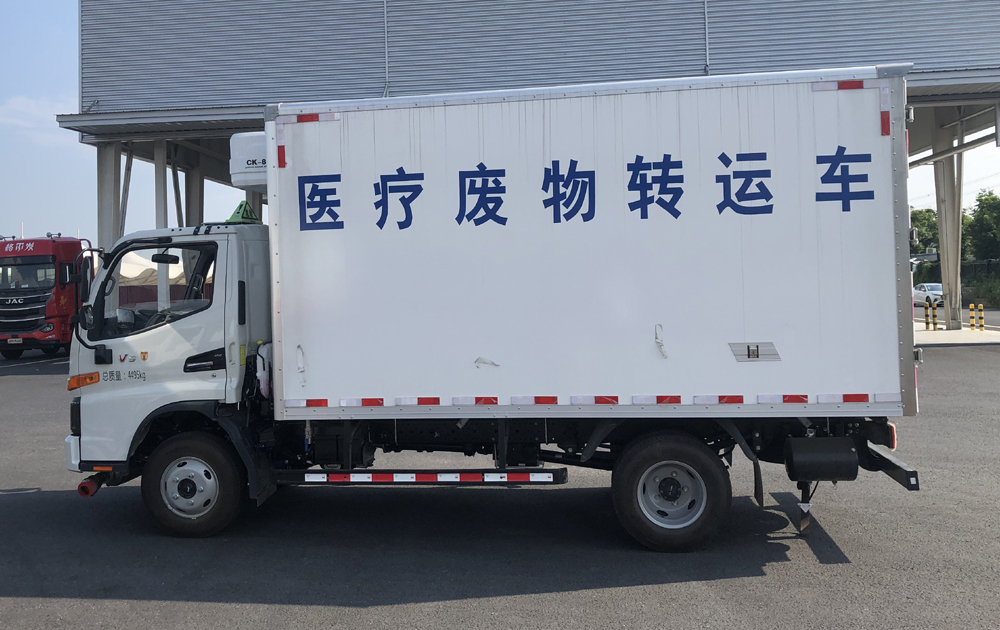 (8)医疗废物转运车厢体前、后和两侧设有医疗废物专用和警识标识。驾驶室两侧喷涂医疗废物转运单位名称。