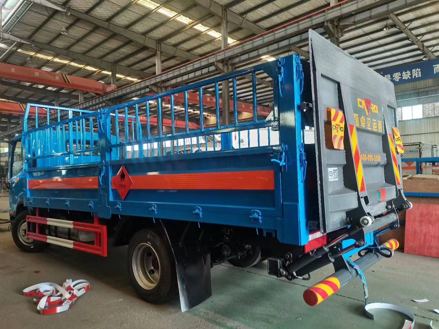 解放J6F国六5米1气瓶车采用的是整车蓝色危险品车底盘,潍柴160马力发动机,带中控锁、电动门窗、原厂空调,采用的是J6F国六驾驶室,客户采用的定制蓝色是为了更加炫彩夺目的,也起到警示作用。该车采用的是可拆卸式花栏结构,配置的是1.5吨液压尾板,客户搬运重气瓶,直接用尾板就可以装卸货物。