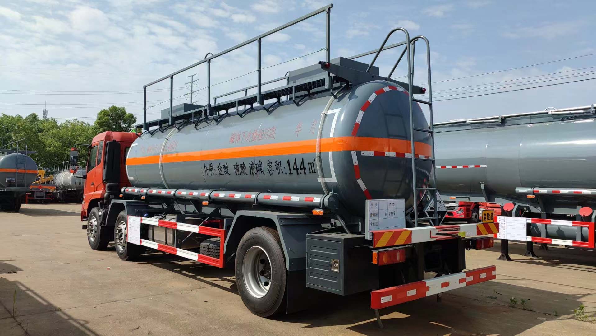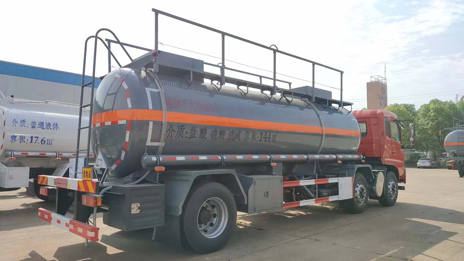 东风天锦红色三轴国六腐蚀品罐式运输车公告型号:DLQ5260GFWD6,采用的是东风天锦危险品专用底盘,高端VR驾驶室,康明斯210马力发动机,带中控锁、电动门窗、原厂空调,罐体容积14.4立方,钢衬塑罐体,单仓自流,一个不锈钢衬四氟海底阀,两个钢衬塑球阀卸料口,整车自重9800kg,额载15吨货不超重。外罐体材料为Q235B型碳钢板材,筒体4mm,封头5mm,罐体通仓,蝶形封头,内衬聚乙稀塑厚度20mm,双层钢塑式防浪板,两个欧标罐口,罐体尾底部带一套DN100型不锈钢衬四氟紧急切断阀(海底阀带声光报警装置),副梁前高后低,4寸衬塑管道,尾部大梁下左右边各一个DN80型衬氟球阀出口为出料口并带全塑保护箱。罐体顶部带方盒子式上围板,围板内做衬塑防腐,带不锈钢升降护栏,玻璃钢方格走道,尾部爬梯,两根卸料管带PVC炮筒管,两个8KG灭火器,一个工具箱,其余按厂家标配生产制作。