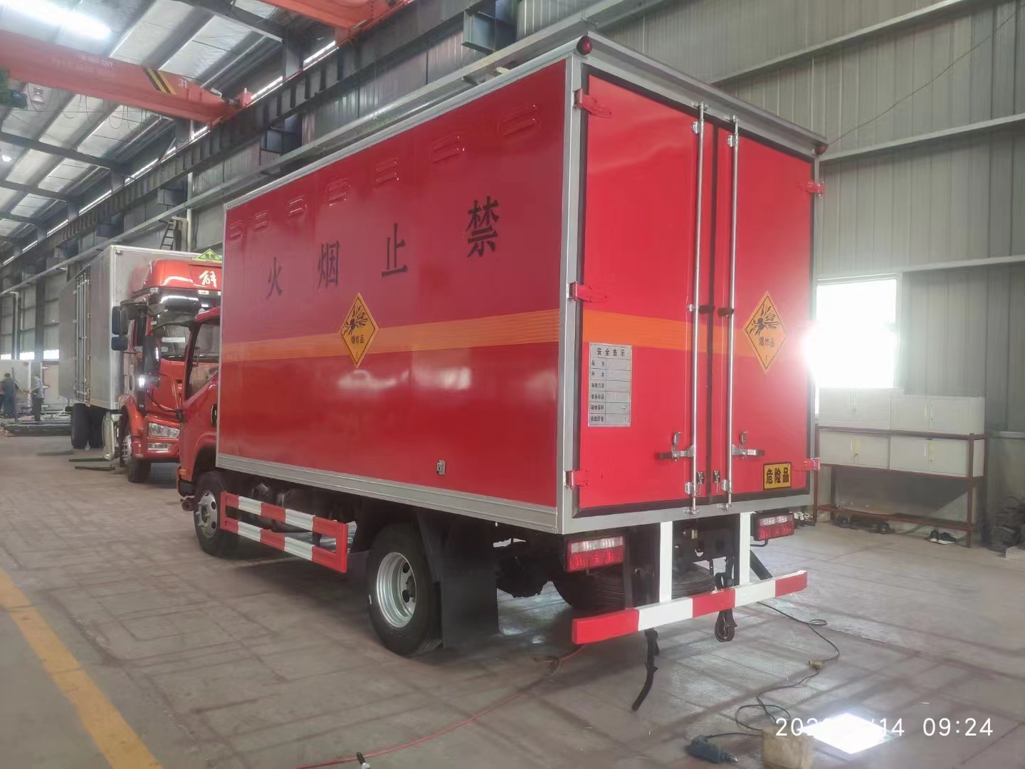 解放虎V国六红色危险品车采用的是解放危险品车专用底盘,锡柴130马力发动机,带中控锁、电动门窗、原厂空调,宽体3人座,该车配置有多功能方向盘,为了让长途运输更方便,该车采用的是120L油箱,7.00R16真空胎,带后处理器前置、排气火花熄灭器、前盘后鼓制动器。带北斗+GPRS行车记录仪,爆胎应急安全装置,带静电拖地带,原厂危险品专用底盘。根据客户要求定制的红色,整车看起来更醒目别致。箱体全部采用的是防阻燃材料,外冷板内铝板,中间夹防阻燃材料,专为防爆车设计,采用的是防静电处理。该车箱体容积可达17立方,货箱宽度可达2米1,该车侧门可选单开侧门,也可选双开侧门,根据装载货物不同,该车可选择不同的样式。