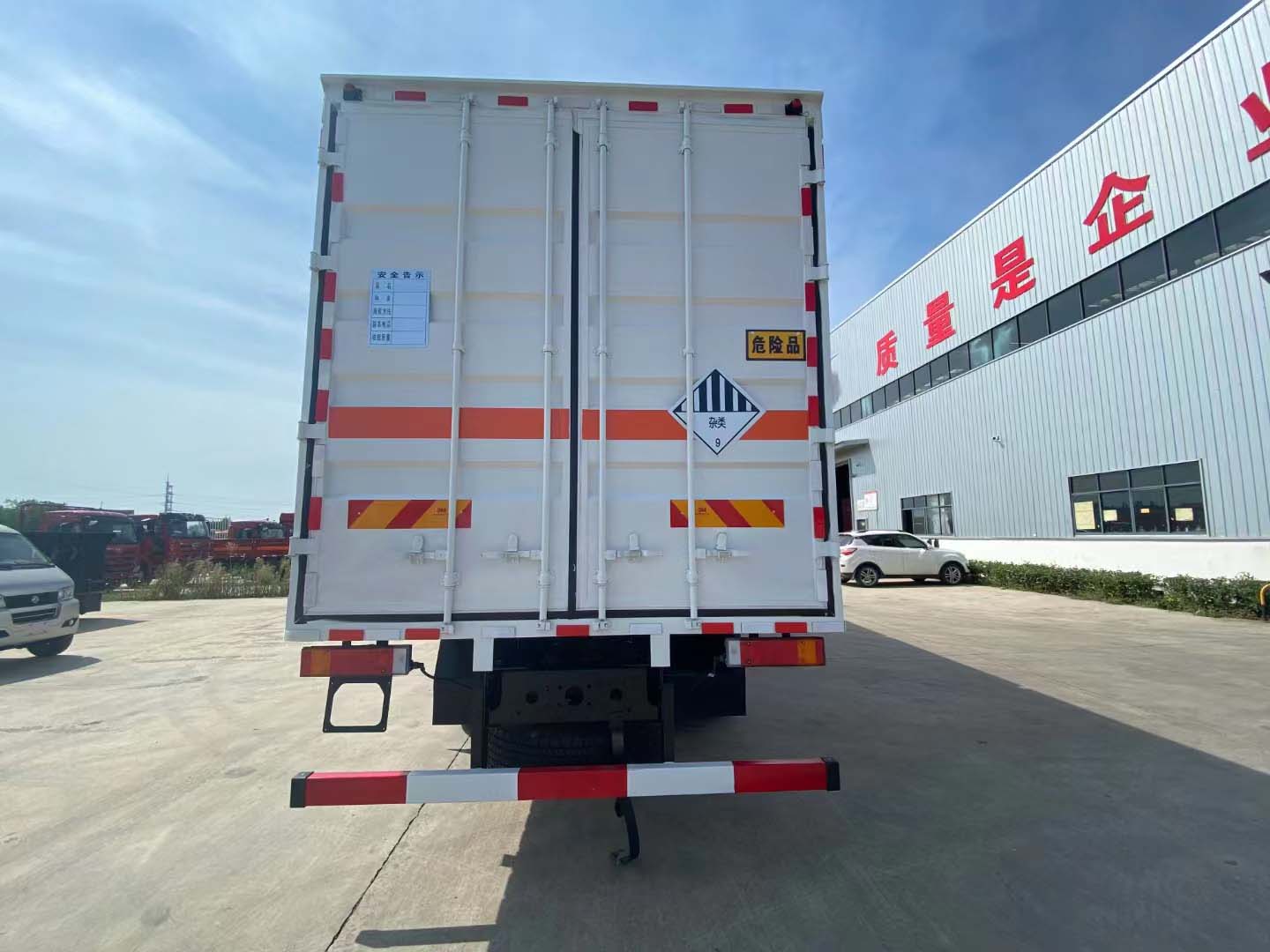 东风专底D7V国六前四后八杂项危险品厢式运输车墙板用厚度1.2MM冷轧板,副梁(14号槽钢), 横梁(10号槽钢),边框(12号槽钢),车厢底板铺4毫米厚花纹板,箱体采用的是瓦楞板箱体,为了装货更方便,采用的是三个双开门,基本上侧门全部开启,车厢底板铺静电胶皮,随车带两根接地防静电胶带和两个4公斤灭火器,可根据需求选装液压尾板。