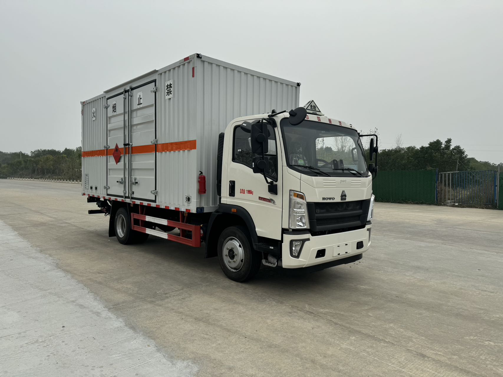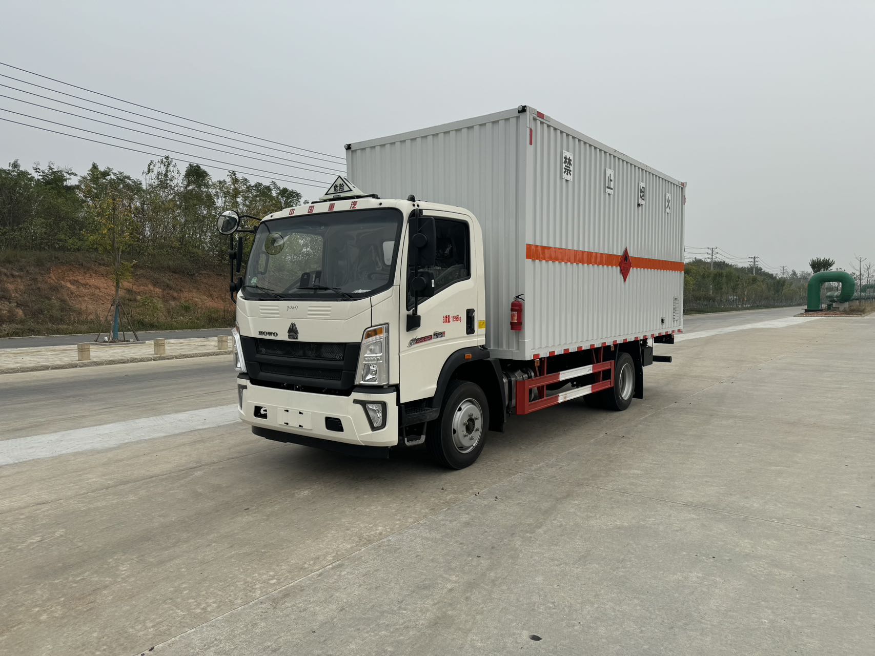 重汽豪沃6米2爆破器材运输车严格按照公告尺寸制作,带百叶窗,内饰为导电性能良好的铝平板有透气孔,矩形骨架结构内部填充防火阻燃材料,复合加铆合工艺。厢体四周铝合金包边及包角,车厢底板铺设防静电胶皮,厢体前脸50公分高铺设防静电胶皮。后部设置对开门,右侧标配单侧门,厢体内部两侧安装捆绑货物的卧环。厢体内部安装烟雾报警器,门上安装防盗报警器。车厢一周粘贴橙色反光带,箱体粘贴菱形标志牌,安全告示牌,危险品牌,箱体安装示廓灯(前白后红),拖地静电带。