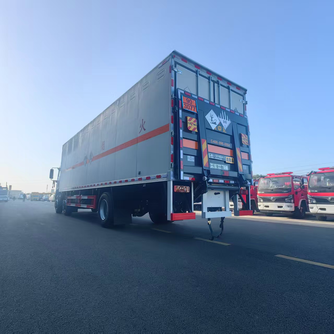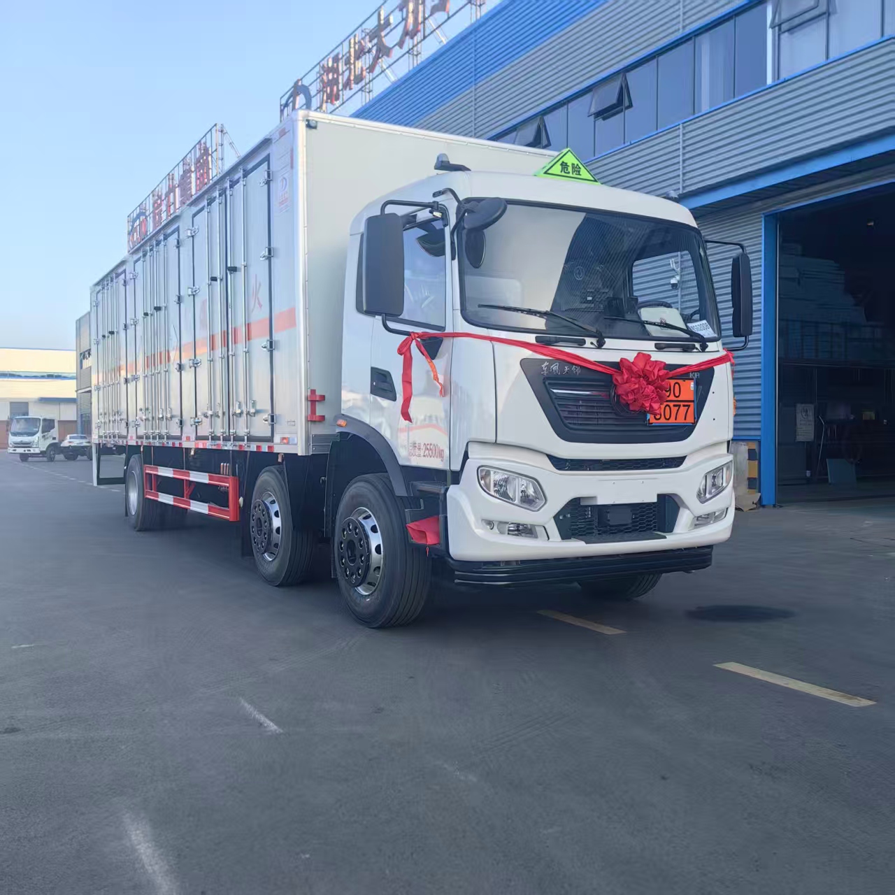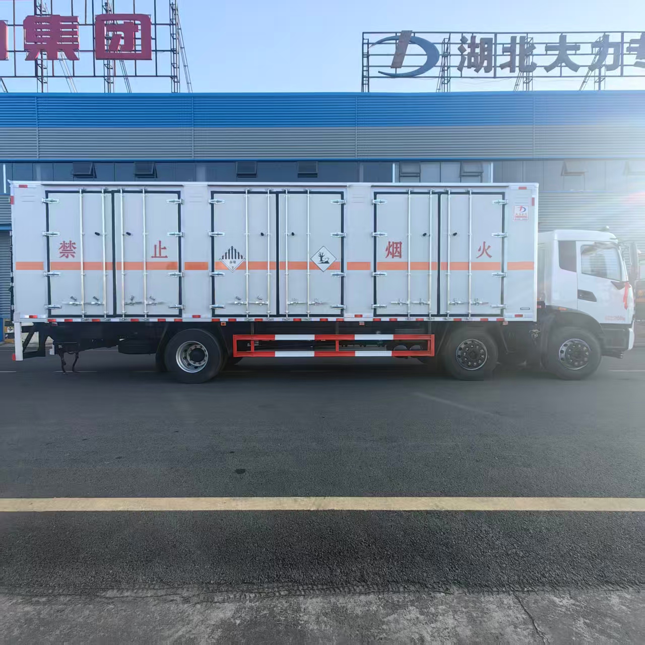 东风天锦三轴国六9米6杂项危险品车是目前市场上少有的额载大,箱体长的车型,尾部可加装液压尾板,整车不超重。