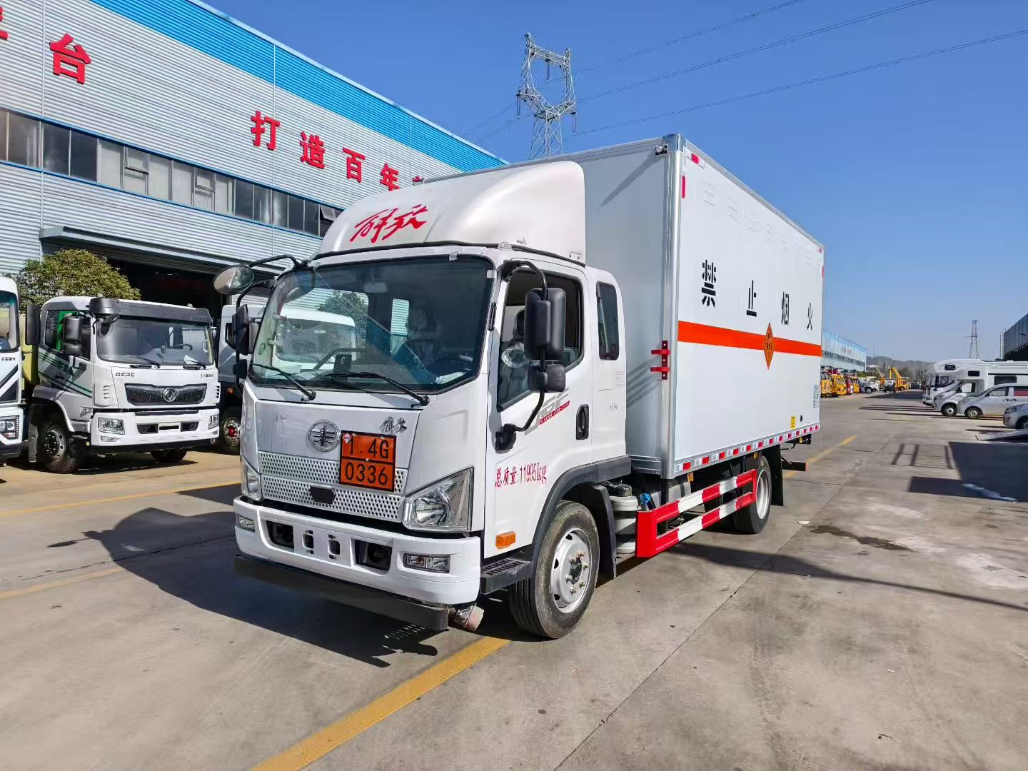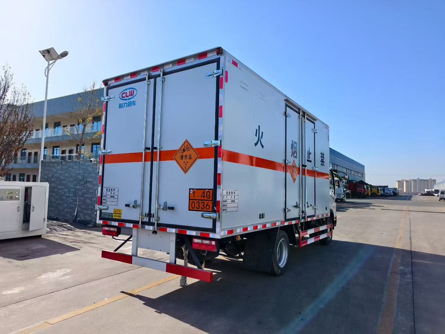 解放J6F国六带导流罩爆破器材运输车针对市场上所需,箱体选用的是专用防爆箱体,车厢采用Q235优质碳钢整体焊接,外板厚度达2.5mm,内板铺设防静电胶皮,杜绝摩擦产生静电;车厢侧面开设通风窗与防爆观察孔,既保证空气流通,又能实时监控内部状态;后门加装双重防盗锁具,配合车厢与底盘的静电接地装置,从源头切断火源、静电隐患。