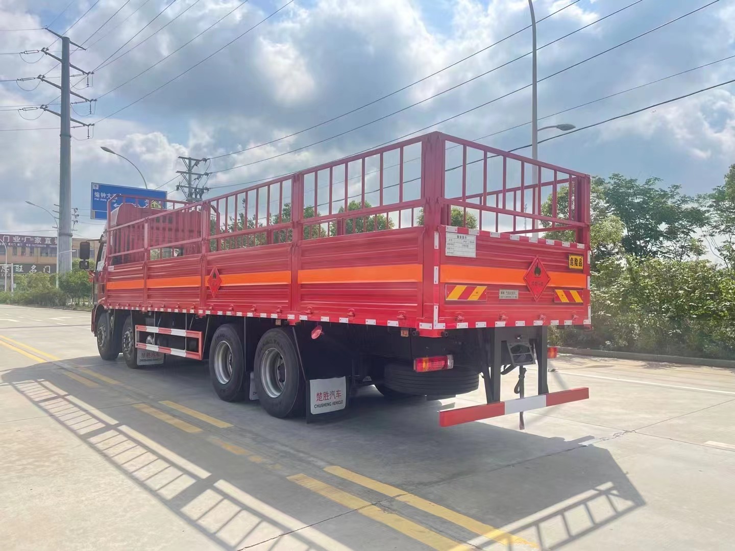 厢体边板采用1.2mm冷板,底板标配4mm花纹钢板,花栏及花栏立柱可拆卸,底部立柱固定,底板上方铺静电胶皮,底板均做防锈处理,车厢一周粘贴橙色反光带,箱体粘贴菱形标志牌,安全告示牌,危险品牌,拖地静电带。