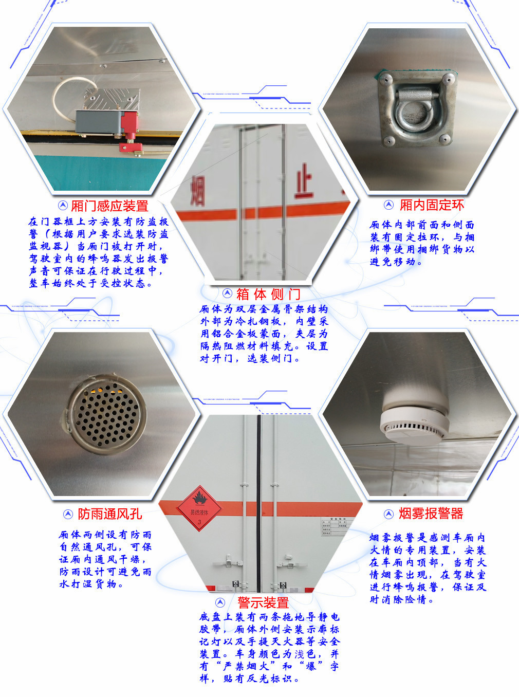 该车适用于运输危险品。厢体顶部封闭,不可开启。选装右侧箱体不开门,选装侧门型式及位置。仅采用底盘子午线轮胎和带ABS的底盘,该车前轮安装盘式制动器,前置排气管,装配限速装置,限速80km/h。安装带有卫星定位功能的行驶记录仪。安全装置为导静电带,用于防止静电。侧防护和后防护装置材料材质为Q235A碳钢,侧防护与箱体副梁焊接连接,后防护装置与车架采用焊接连接。后防护截面尺寸(mm):100×50,离地高度为480mm。该车用于运输独立容器包装的介质:粘合剂,涂料,料溶液,煤油,机油,苯,甲醇,乙醇,丙酮,甲苯,二甲苯,油漆,类项号:3。 |